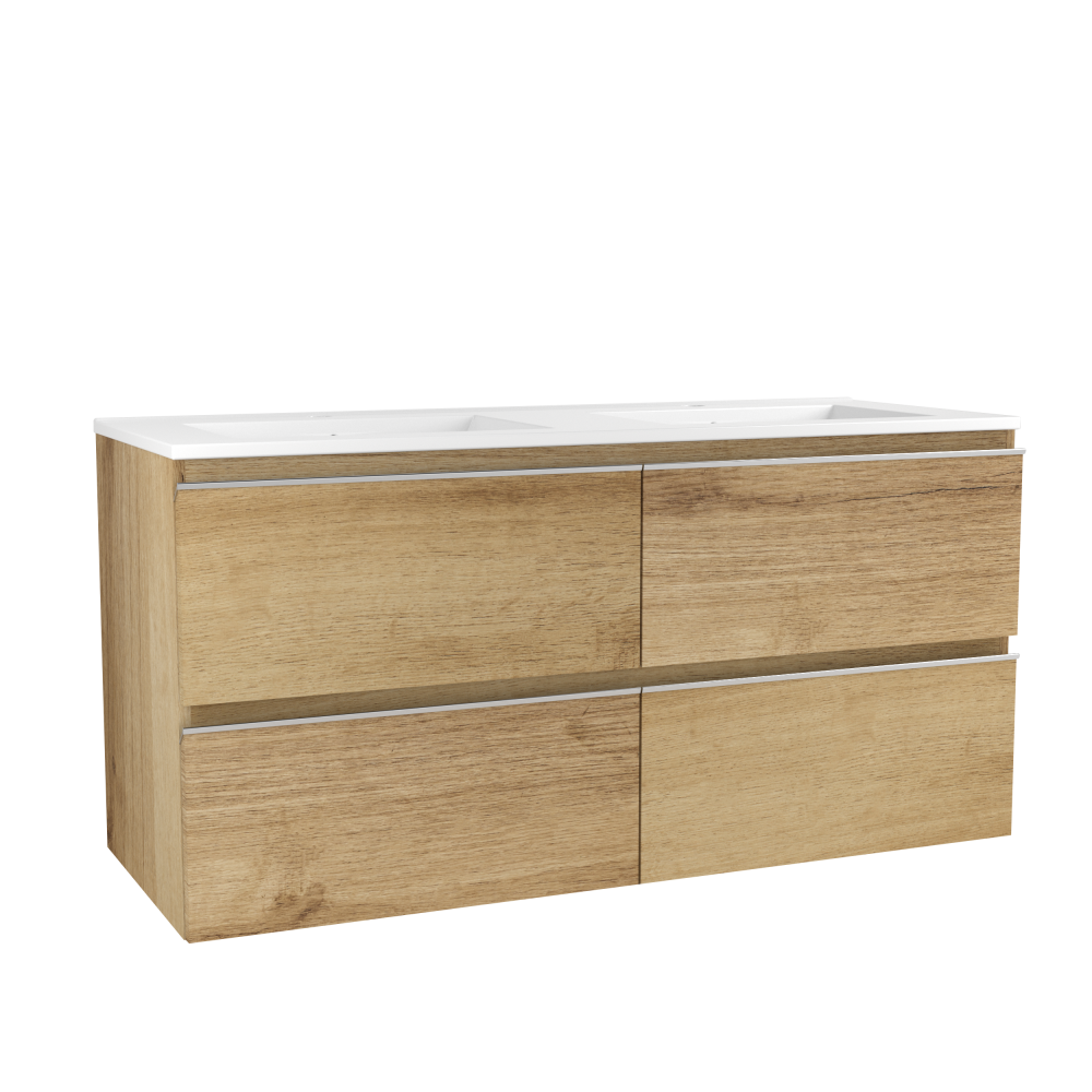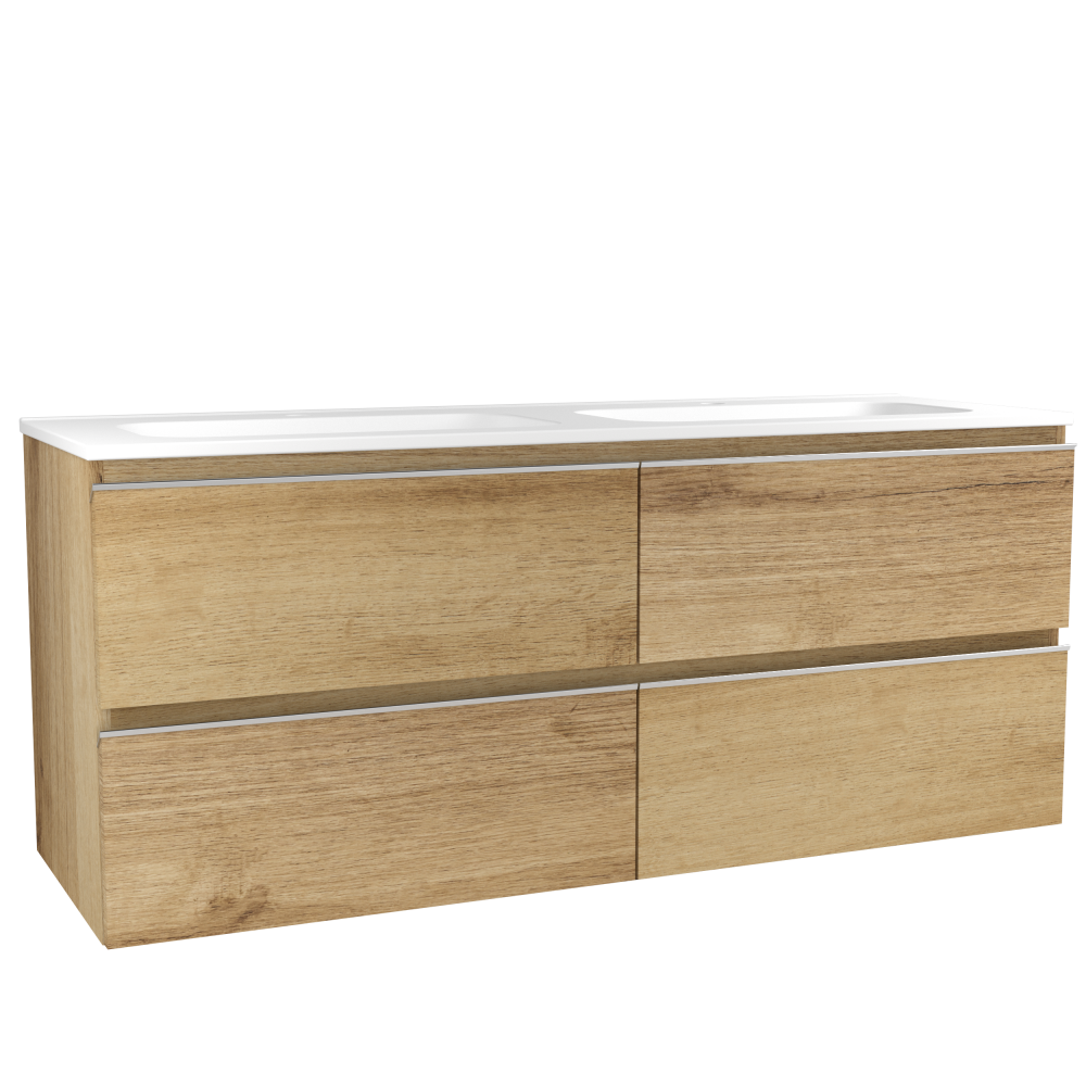 Les meubles sont équipés de tiroirs coulissants avec fermeture progressive et d’une vasque céramique blanche Ceres, accompagnée d’un miroir simple assorti. Cette gamme permet de composer des salles de bains harmonieuses, à la fois pratiques et élégantes.